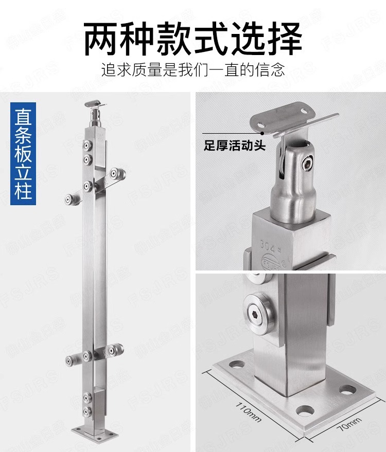 此产品为工程护栏立柱,多次被市政府,高铁站,飞机场,超商,大型企业采购。强度高,耐磨损,耐腐蚀,色泽好。加厚价款底座更加结实耐用,圆棒玻璃夹安装方便