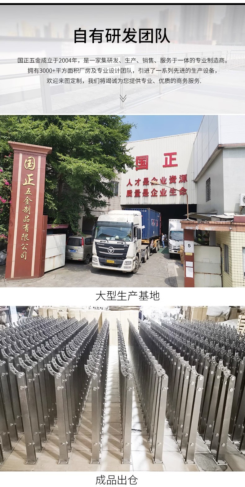 公司设立:裁切车间,焊接车间,零配件生产车间,组装车间,为建筑工程商,提供一站式 不锈钢护栏以及不锈钢配件供应