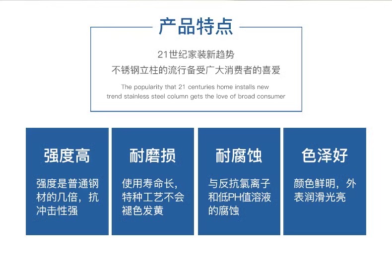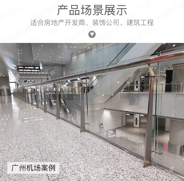 此产品为工程护栏立柱,多次被市政府,高铁站,飞机场,超商,大型企业采购。强度高,耐磨损,耐腐蚀,色泽好。加厚价款底座更加结实耐用,圆棒玻璃夹安装方便