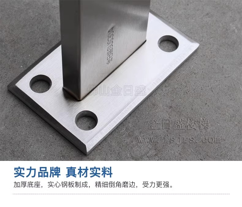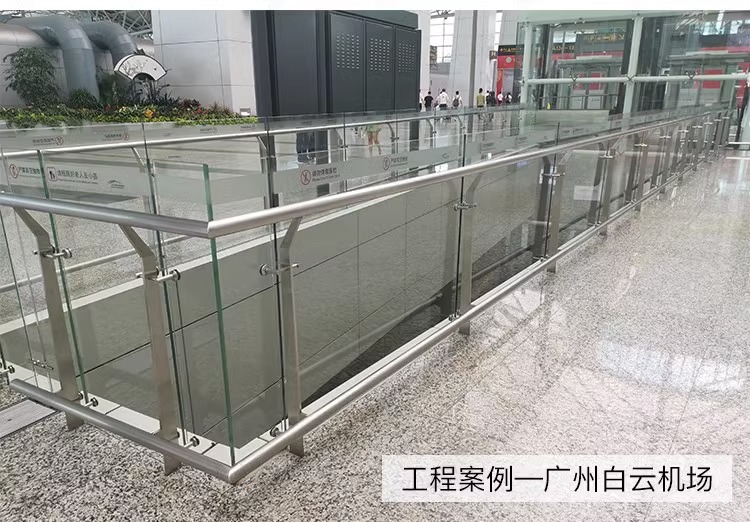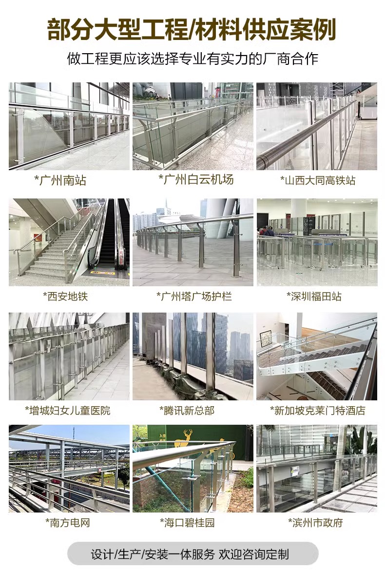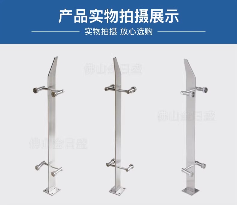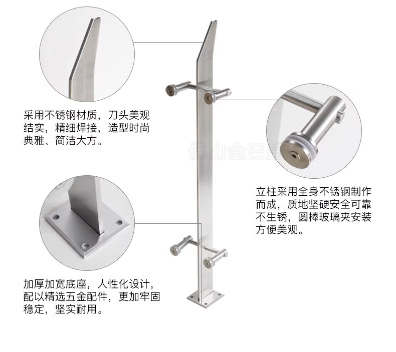 此产品为工程护栏立柱,多次被市政府,高铁站,飞机场,超商,大型企业采购。强度高,耐磨损,耐腐蚀,色泽好。加厚价款底座更加结实耐用,圆棒玻璃夹安装方便